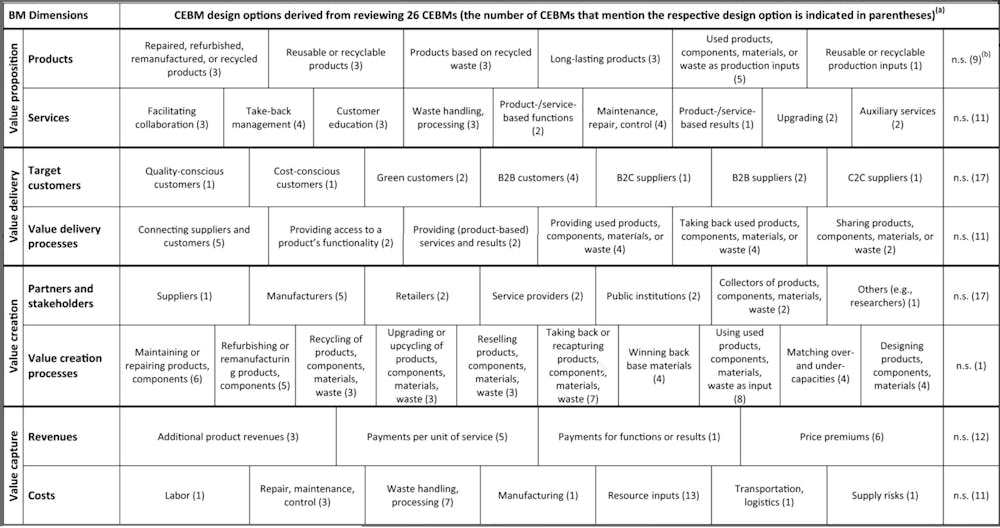 The article presents a comprehensive overview of 26 circular economy business model patterns identified in the literature. In addition, these patterns were summarised in a ‘morphological box’ that provides a handy and useful overview of the various design options available to circular economy business designers.